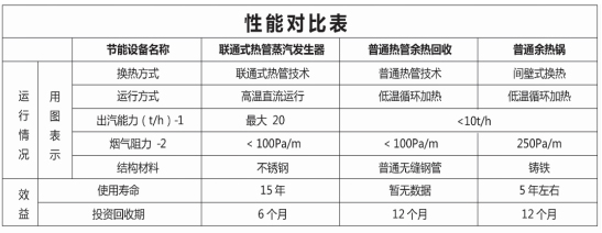 余熱鍋爐即創元聯通式熱管蒸汽發生器,是由創元公司與中國計量學院、浙江大學聯合設計研發的換熱設備。其換熱元件為高能效聯通式熱管,設備主體材質根據煙氣的露點及耐腐蝕性選定,如ND鋼、316L不銹鋼、碳鋼等,產蒸汽壓力及溫度根據節能用途設定。針對排煙溫度過高的鍋爐,可以利用其高溫煙氣余熱生產高品位的蒸汽,結合聯通式熱管余熱回收器效率高達90%以上。